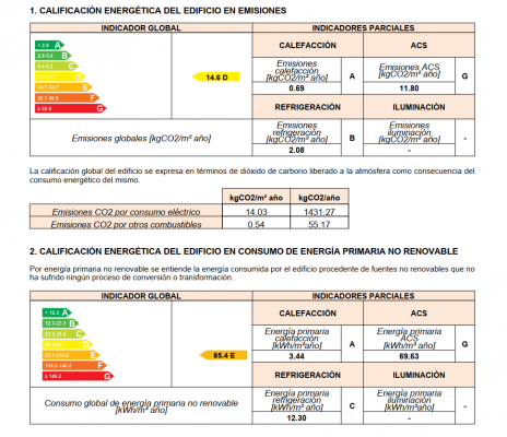 - Certificado de eficiencia energética (formato .pdf): Es el documento principal y contiene los valores que definen la eficiencia de nuestra vivienda, la demanda energética y emisiones de CO2 para la generación de ACS (Agua Caliente Sanitaria), calefacción y refrigeración.
